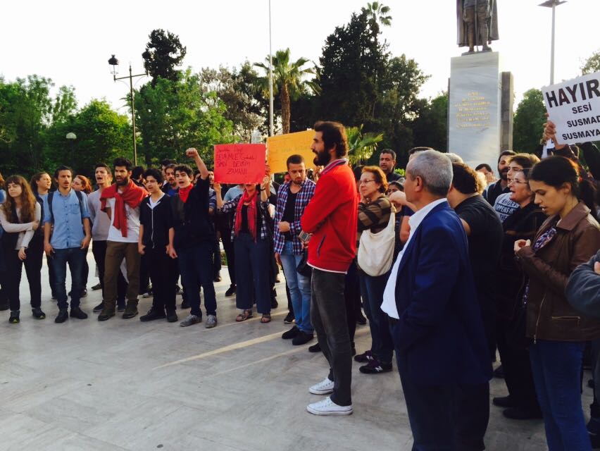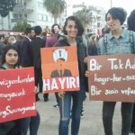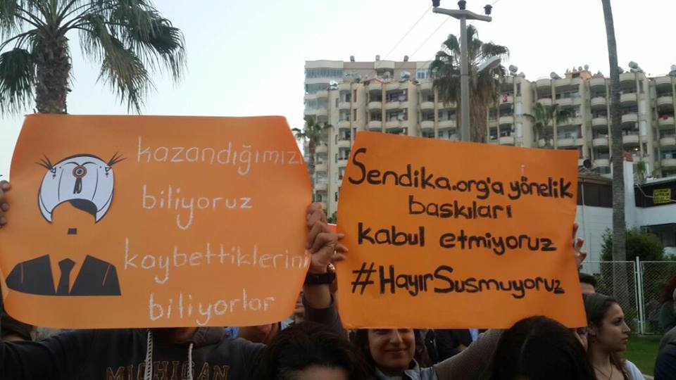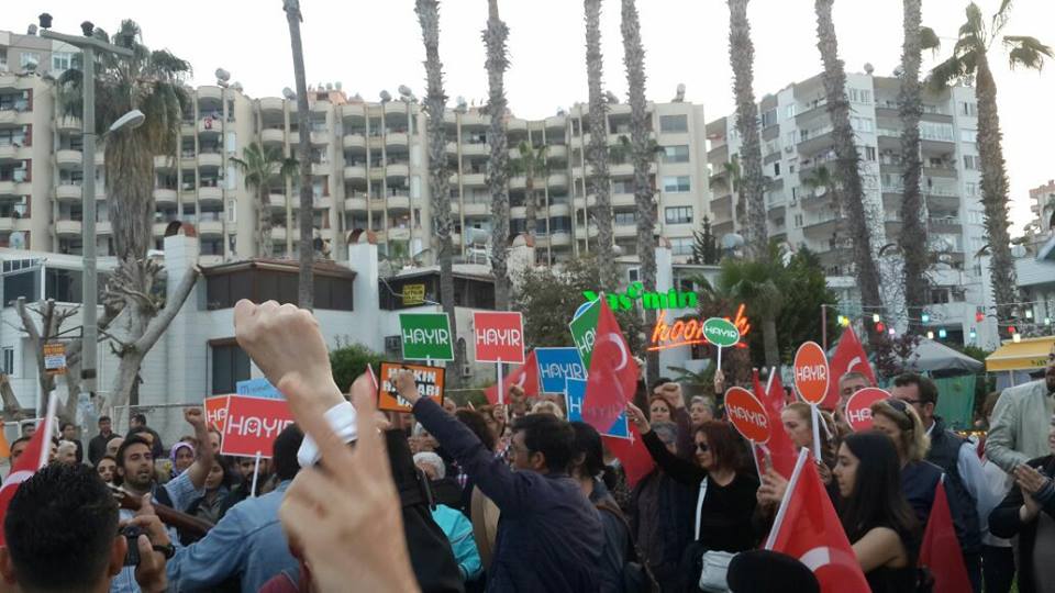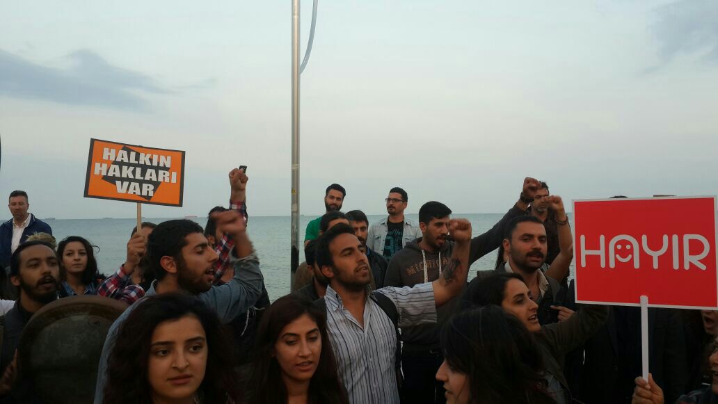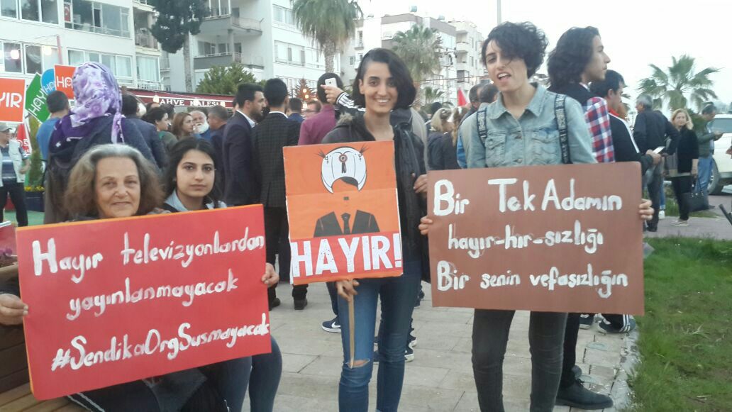 Mersin, Viranşehir sahilinde bir araya gelen “hayır”cılar, sloganlarla “hayır”larına sahip çıkacaklarını ilan ettiler. Mersinliler eylemlerinde gözaltına alınan Sendika.Org editörü Ali Ergin Demirhan ve her gün kapatılan sitemizle dayanışma için dövizler taşıdı.