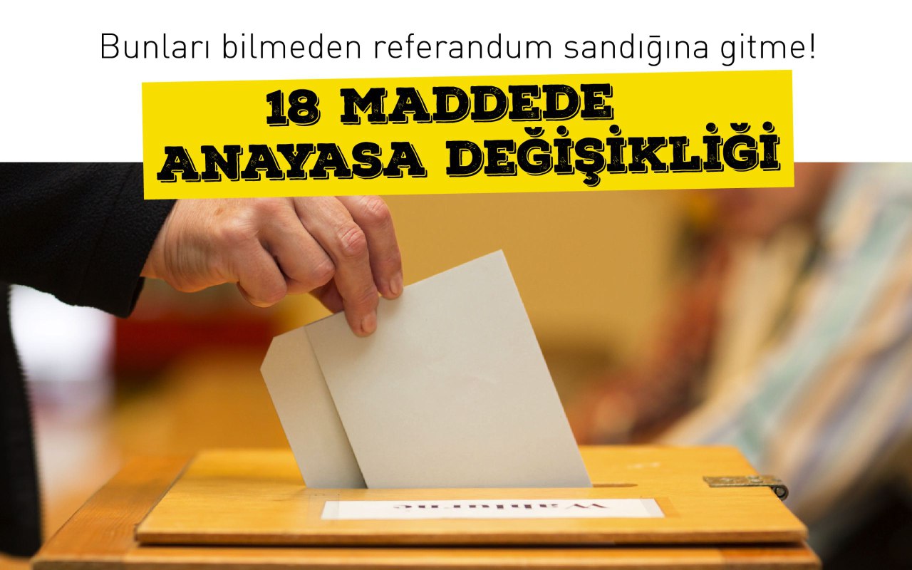 Ulaştırabildiğimiz herkesin Anayasa değişikliğinin içeriğini, yaratacağı sonuçları Anayasa maddelerini de vererek anlatan aşağıdaki 18 maddeyi okuyup sandığa gitmesini sağlayalım. Bu yazıyı ilettiğimiz herkesten de içeriği paylaşmasını isteyelim. 16 Nisan’da sandıklarda görüşelim!