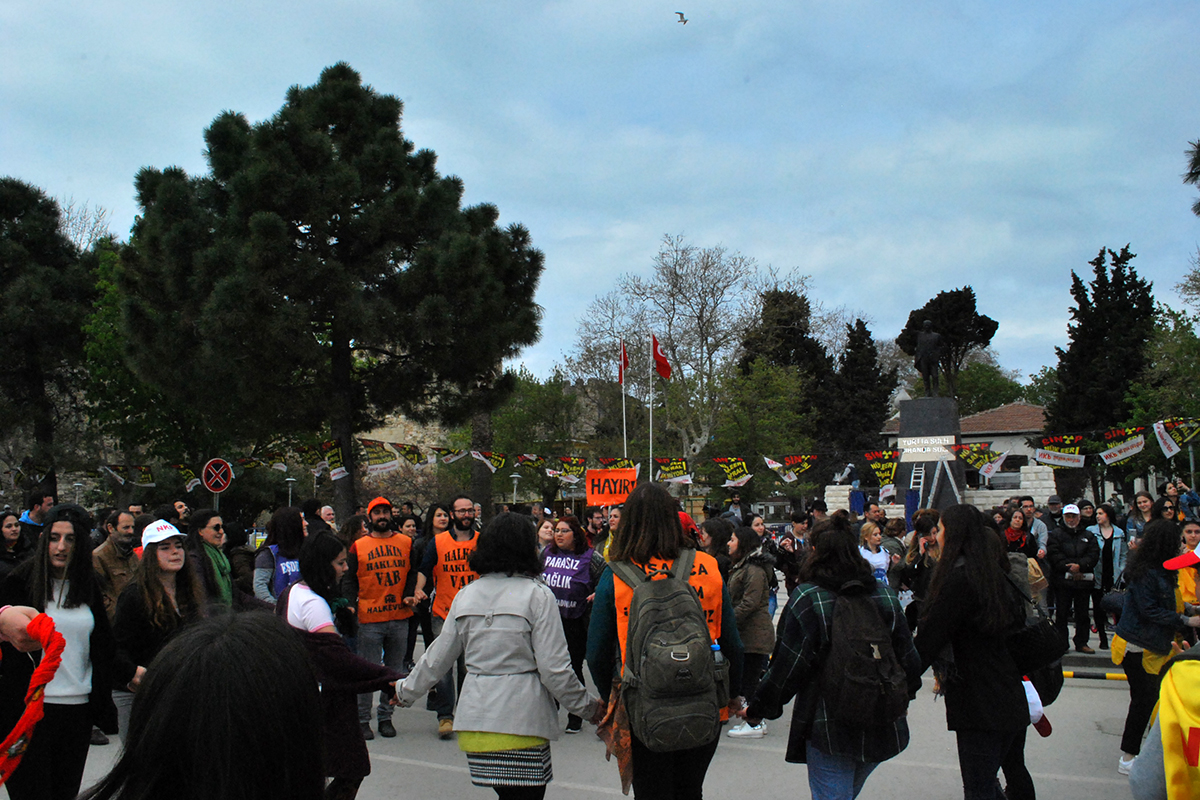 Diyojen heykeli önünde buluşan yüzlerce kişi sloganlarla mitingin yapılacağı Uğur Mumcu Meydanı’na yürüdü.