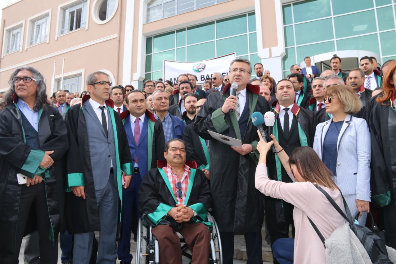 Ankara Adliyesi Dışkapı Ek Hizmet Binası’nın önündeki baısn açıklamasına, Ankara Barosu Başkanı Hakan Canduran, Genel Sekreteri Aşkın Demir, Saymanı Evrim Dost, Yönetim Kurulu üyeleri Ayşe Köseyener, Şırahbil Emre Acer, Özgür Ökmen ve Çağrı Ayhan Şenel de katıldı. Ankara Barosu adına basın açıklamasını Başkan Avukat Hakan Canduran okudu.