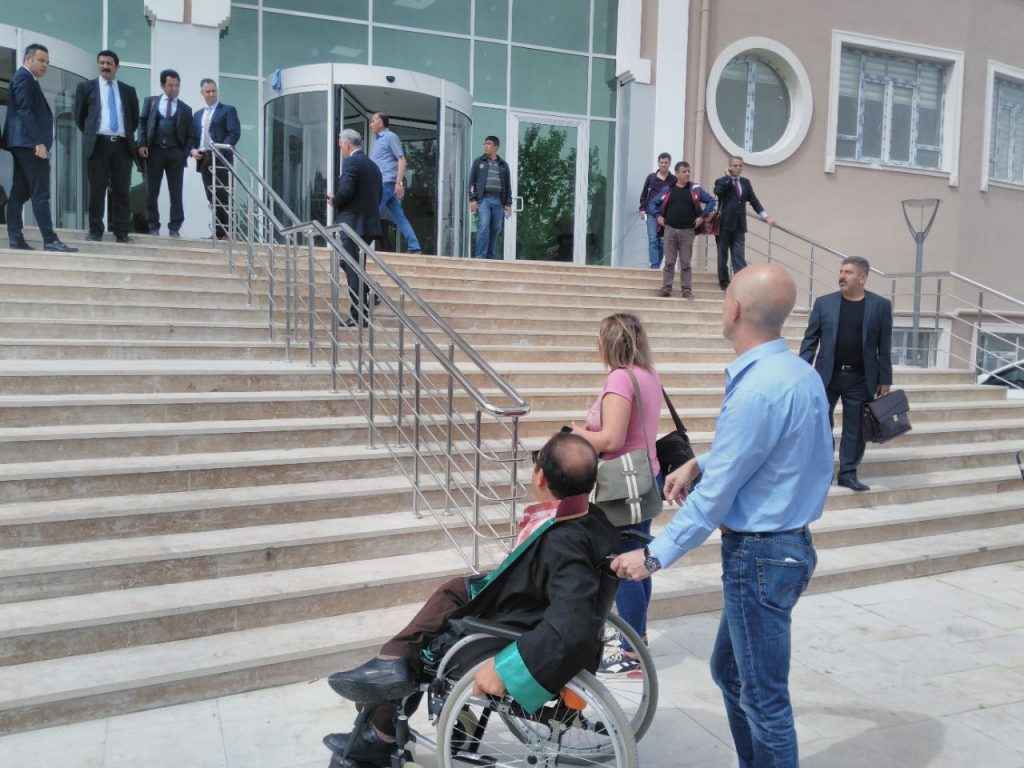 Basın açıklamasının ardından binanın fiziki uygunsuzluğuna dikkat çekmek için Dışkapı Adliyesi’ne gelen tekerlekli sandalyeli bir meslektaşlarını beraber bina içine taşıyan avukatlar, adliye önünde oturma eylemi yaptılar.