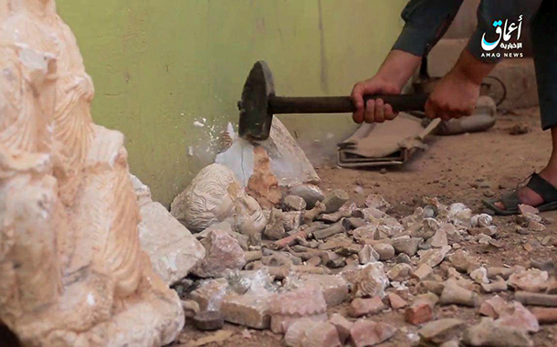 Görüntülerde örgütün “Antik Eserler Komitesi”nden olduğu belirtilen bir kişi elinde bir balyozla tarihi eserleri parçalarken gözüküyor.