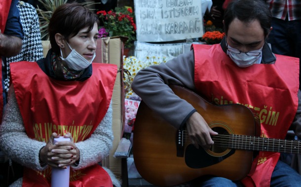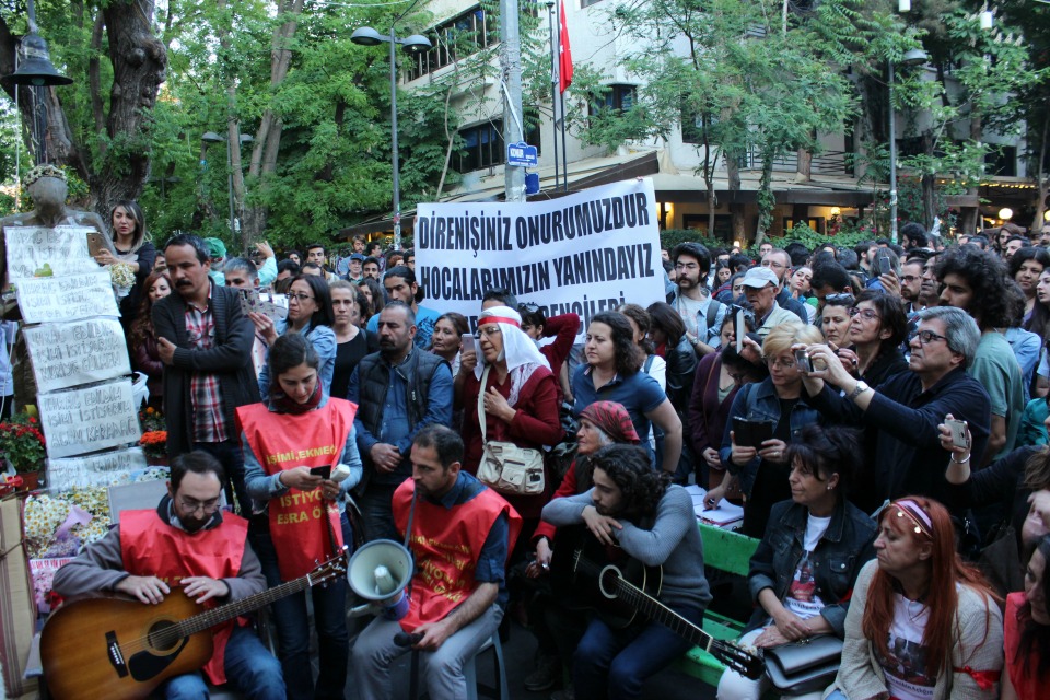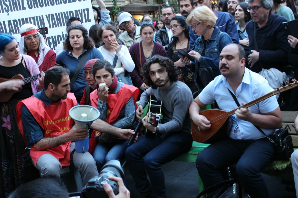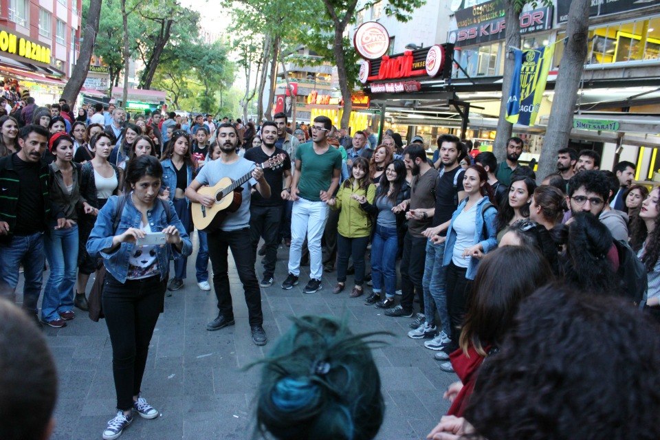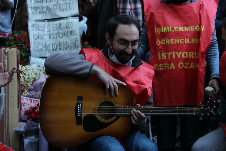 Açlık grevinde sağlık koşulları giderek kritik bir aşamaya gelen Nuriye Gülmen ve Semih Özakça’nın direnişlerine direnişlerine destek veren kitlelerin sesi her geçen gün büyümeye devam ediyor. OHAL kapsamında KHK ile ihraç edilen Gülmen ve Özakça, işlerine geri dönmek ve direnişlerinin sesini yükseltmek için bu akşam Ankara’nın göbeğinde “Yaşam için söyle” dedi. Bu akşam, Yüksel Caddesi’ndeki İnsan Hakları Anıtı’nın önünde buluşan kitleye, Özakça gitarıyla beraber, Grup Yorum’dan “Bir Mevsim” şarkısını söyledi. Destek olan herkes, bir ağızdan Özakça’ya eşlik etti.