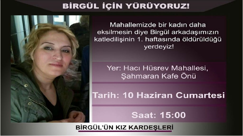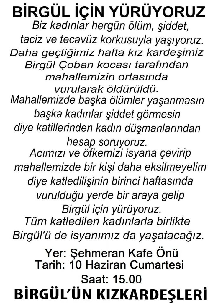 Yıllardır kadına yönelik şiddetin sıkça yaşandığı hatta “normalleştiği” mahallenin kadınları Birgül’ün ardından “Yeter artık” diyerek 10 Haziran saat 15.00’da mahallede eylem yapacak. Birgül’ün kızkardeşleri olarak çağrı yapan kadınlar, “Acımızı, öfkemizi isyana çevirip mahallemizde bir kişi daha eksilmeyelim diye katledilişinin birinci haftasında vurulduğu yerde bir araya gelip Birgül için yürüyoruz” dedi.