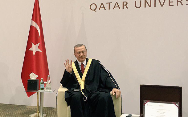 Tayyip Erdoğan, Katar Üniversitesi’nden “fahri doktora” aldığı törende, Suudi Arabistan tarafından terör örgütü ilan edilen Müslüman Kardeşler’in Rabia işaretini yaparak kameralara poz verirken…