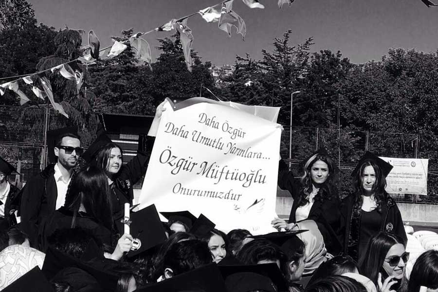 Öğrencilerin, Müftüoğlu için açtıkları pankartta “Daha özgür, daha mutlu yarınlara… Özgür Müftüoğlu onurumuzdur” yazdı.