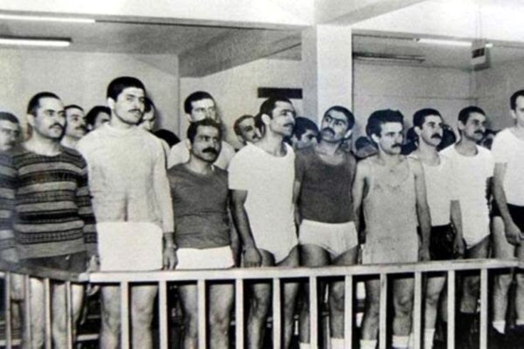 Tek tip elbise giymeyi reddettikleri için mahkeme salonunda iç çamaşırlarıyla kalan THKP-C Üçüncü Yol davası tutukluları. (Fotoğraf: Deniz Teztel, 1983)