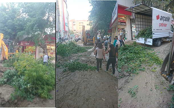 TESKİ’nin taşeronluğunu yapan Fi Yapı’nın saha sorumlusu, bir ağacın altyapı borularına denk gelmesinden dolayı diğer ağacın ise Çetinler Arçelik Firması’nın sahibi İlker Çetin’in ısrarlı isteği üzerine kökünden kopartıldığını, bir ağacında dallarının kırıldığını ifade etti. Çetinler Arçelik’in önünde kesilen ağaç ve koparılan dallar, Çetinler Arçelik’e ait kamyonetle yüklenerek olay yerinden götürüldü.