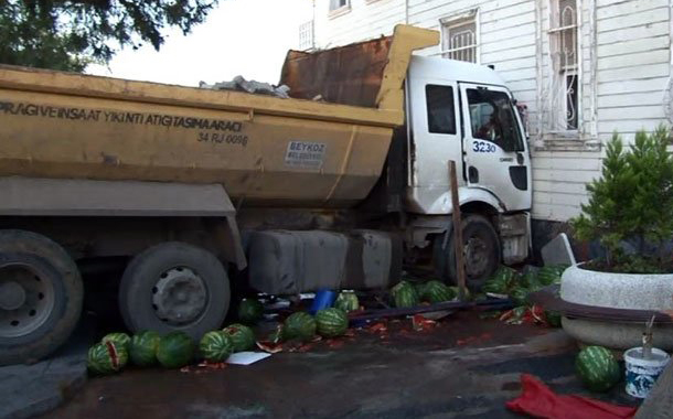Beykoz Belediyesi Fen İşleri Müdürlüğü’ne kayıtlı bir hafriyat kamyonu, sürücüsünün denetimi yitirmesi sonucu biri dolmuş olan üç araca ve bir karpuz tezgahına peş peşe çarptıktan sonra Ahmet Mithat Efendi yalısına çarparak durabildi.