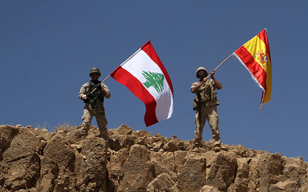 Lübnan ordusunun internet sitesinde yayımlanan fotoğrafta, IŞİD’den kurtarılan Ras Baalbek bölgesindeki Mkhayrme Dağı’nda, Lübnan ve İspanya bayraklarının askerler tarafında yan yana taşındığı görüldü.
