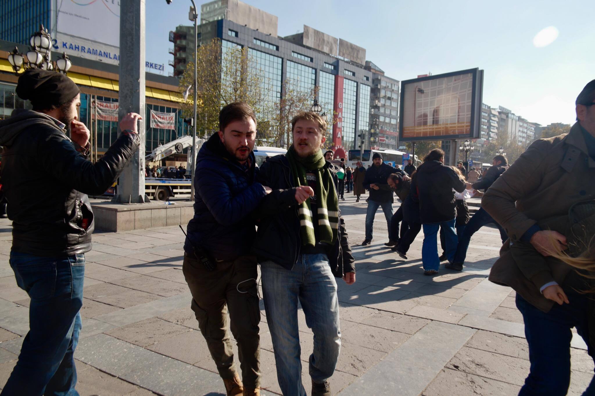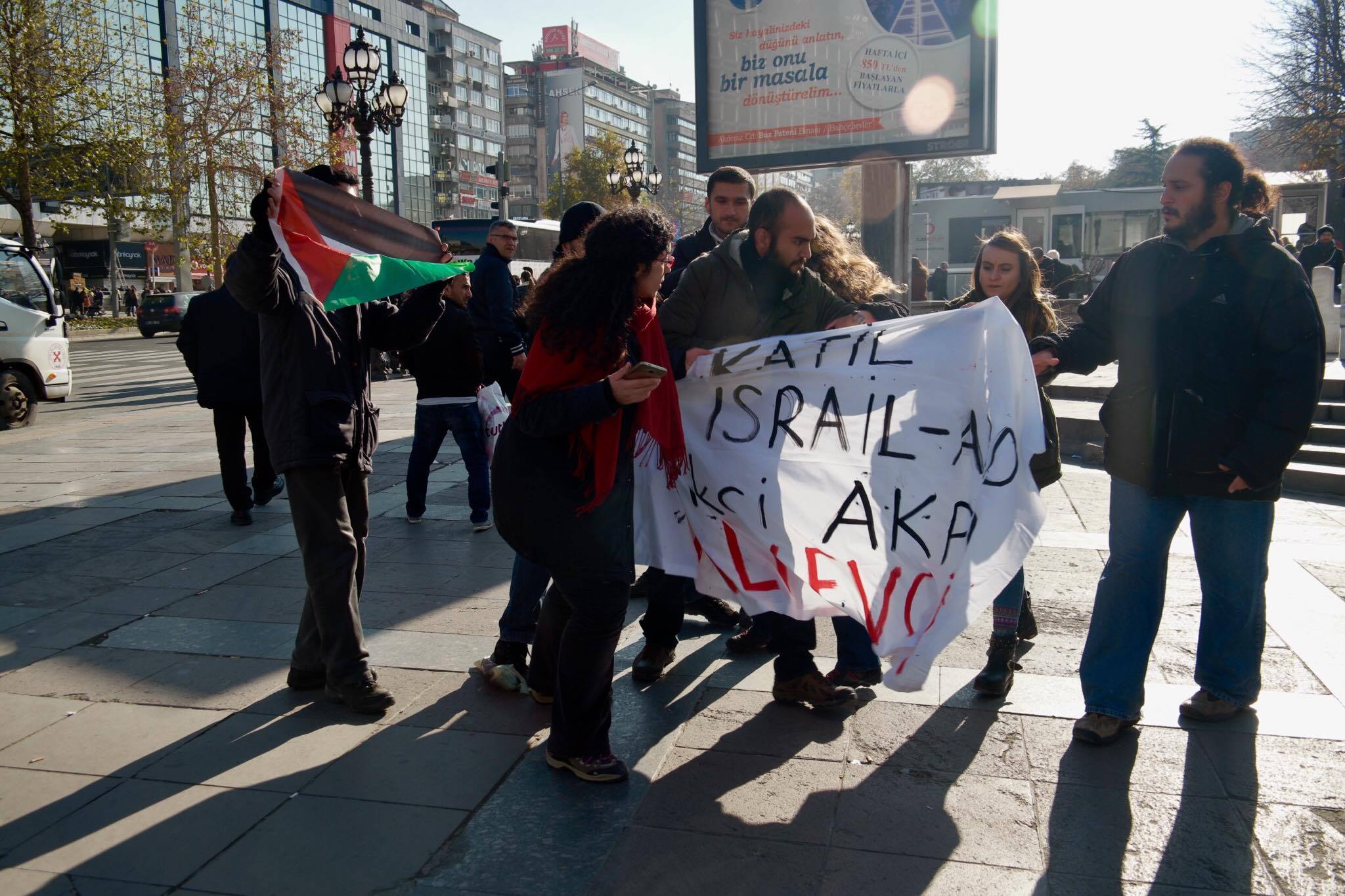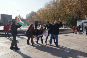 Ankara’da “Filistin halkının yanındayız”, “Katil ABD, Ortadoğu’dan defol” diyerek açıklama yapmak isteyen Halkevcilere polis saldırdı. Saldırıda sekiz Halkevci darp edilerek gözaltına alındı