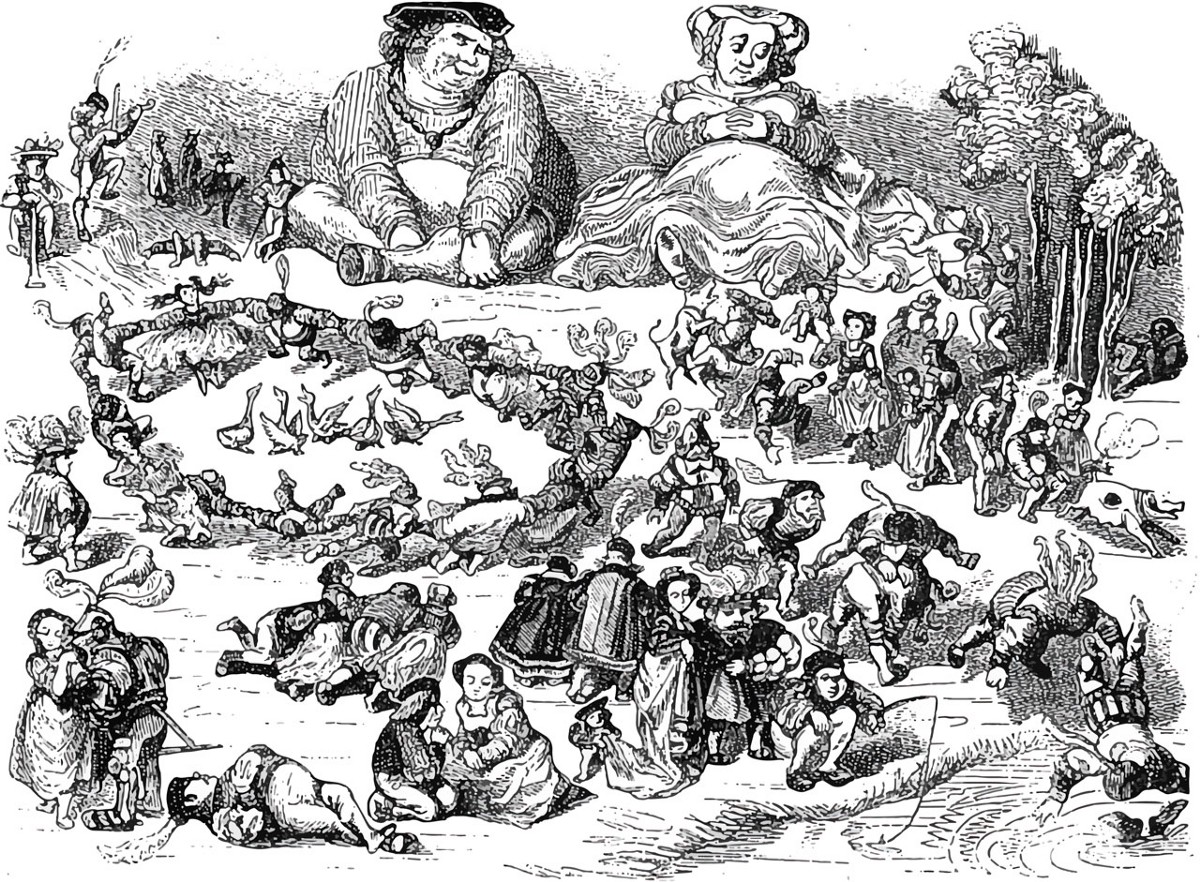 Gargantua, Notre Dame Kilisesi’nin çanlarının çıngırak olarak kullanmak için çalınmasından tutun da, beş hacıyı salata içinde yanlışlıkla yemesine, saçını taradıkça top güllelerinin saçından dökülmesin kadar saçmanın sınırsızlıklarında yüzer.