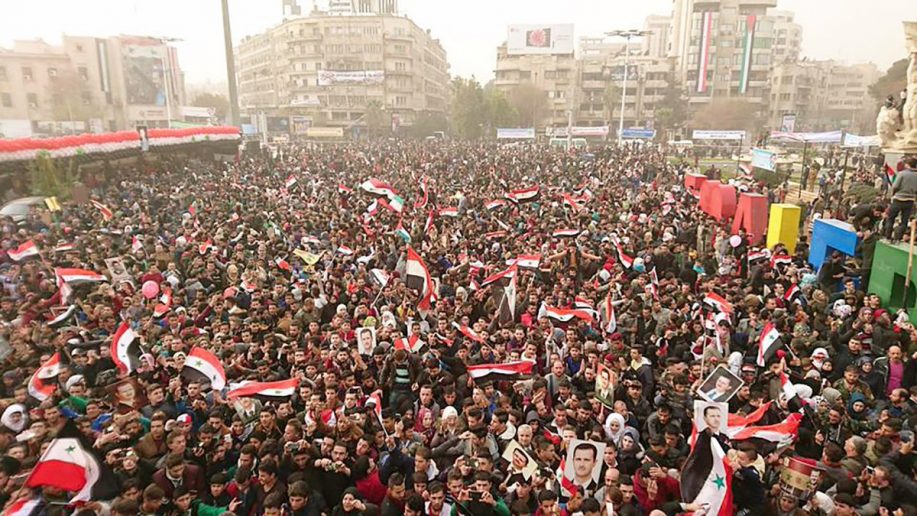 Halep’te kentin cihatçı çetelerden kurtarılışının yıldönümünü kutlamak için binlerce kişi Suriye bayraklarıyla sokağa çıktı