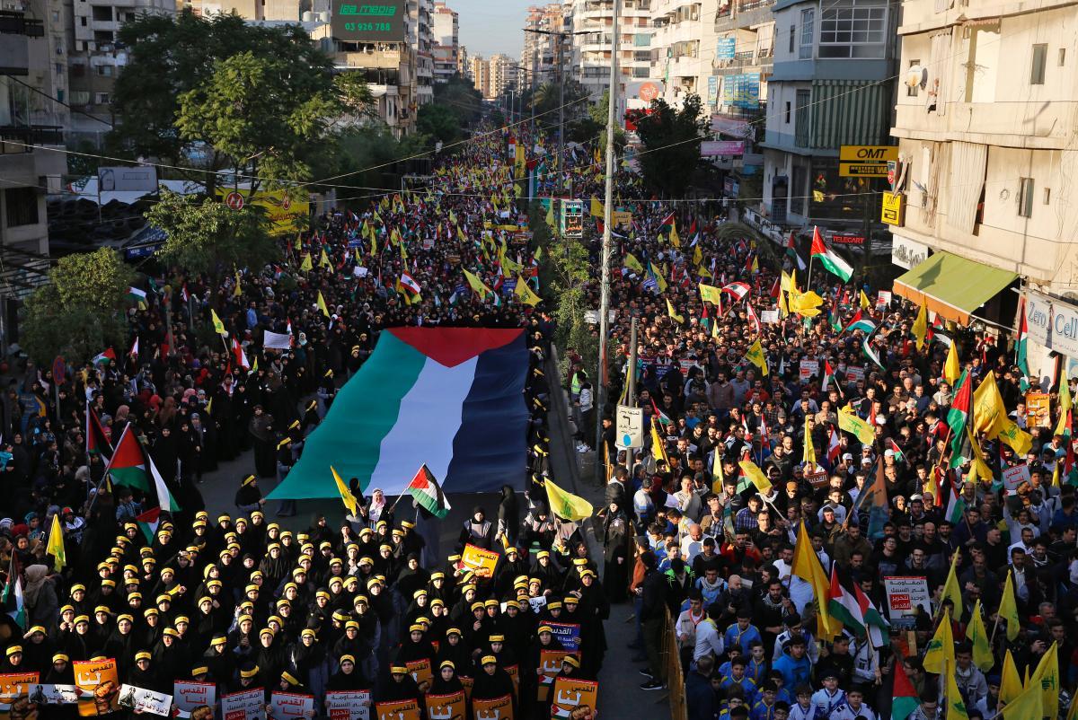 Hizbullah, Lübnan’ın başkenti Beyrut’un güneyinde yer alan Dahiye bölgesinde Kudüs’e destek mitingi düzenledi. Çok sayıda Lübnanlı ve Filistinlinin katıldığı mitingde sık sık ABD ve İsrail karşıtı sloganlar atıldı.