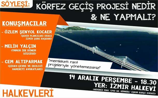 İzmir’in “çılgın proje”lerinden birisi olarak anılan Körfez Geçiş Projesi’ne karşı İzmirliler bir araya gelmeye devam ediyor. İzmir Halkevleri tarafından 14 Aralık Perşembe günü 18.30’da gerçekleştirilecek söyleşide “Körfez Geçiş Projesi nedir, mücadele ederken neler yapılmalı?” sorularına yanıt aranacak