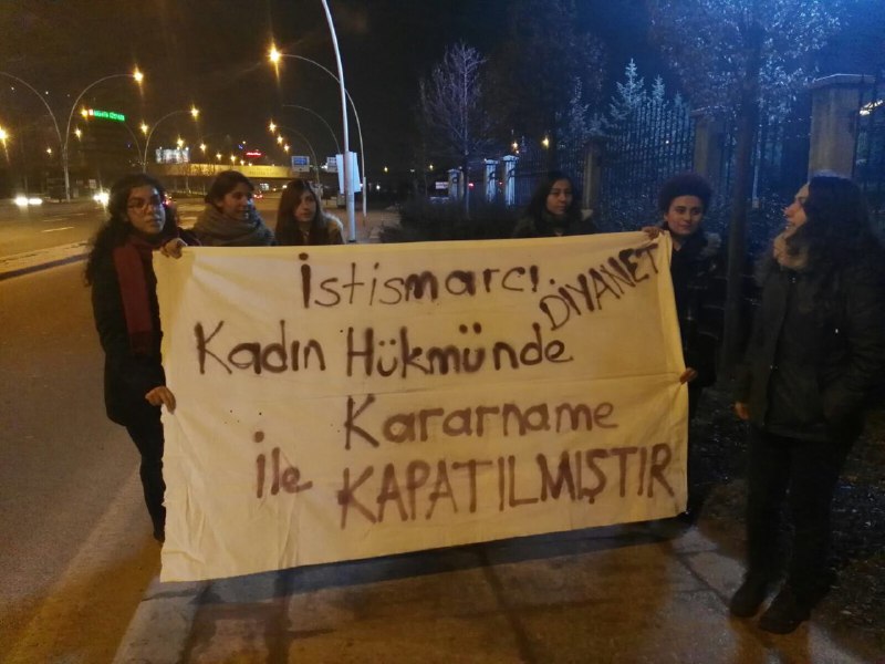 Diyanet İşleri Başkanlığı’nın resmi internet sitesinde kız çocuklarının 9, erkek çocuklarının ise 12 yaşında evlenebileceğinin yazması önce sosyal medyada sonra da sokakta büyük bir tepkiye neden oldu. Bu tepkilerin ilki ise Ankara’dan, “Kadın Hükmünde Kararname” ile Diyanet İşleri Başkanlığı’nın önüne giderek Diyanet’i kapatan ve Diyanet İşleri Başkanı’nı görevden alan Halkevci Kadınlar’dan geldi. Yaptıkları eylemin ardından gözaltına alınan Halkevci Kadınlar ertesi gün “Diyanet kapatılsın” sloganlarıyla yine sokaktaydı. Sakarya Caddesi’nde yapılan bu eyleme de polis saldırmış ve birçok kişi gözaltına alınmıştı.
