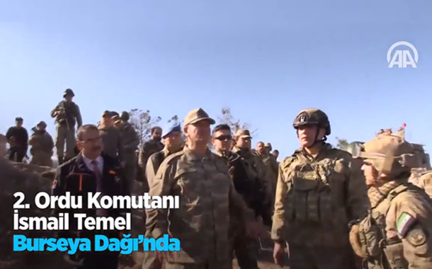 Afrin’e yönelik askeri müdahaleyi komuta eden 2. Ordu Komutanı İsmail Metin Temel, Burseya dağında kıdemli askerlere sorular yöneltti. Temel’e malumat veren askerin omuzunda ÖSO bayrağının bulunması ise dikkat çekti