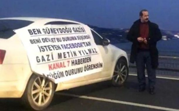 Boğaz Köprüsü’nde gazi olduğunu söyleyen Metin Yılmaz adlı yurttaş yolu trafiğe kapattı. Aracını köprüye paralel olarak parkeden Yılmaz, aracına pankart astı. Pankartta “Beni devlet bu duruma düşürdü” yazan Yılmaz’ın silahının olduğu ve havaya ateş açtığı iddia edildi.