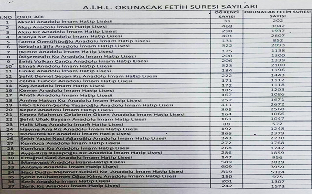 Antalya İl Milli Eğitim Müdürlüğü, il genelinde bulunan 37 İmam Hatip Lisesi’ne yazı göndererek, öğrencilerin 9 Şubat Cuma gününe kadar 100 bin Fetih Suresi okuması yönünde talimat verdi. Okullara gönderilen listede, hangi okulda kaç öğrenci olduğu ve buna göre okul başına kaç Fetih Suresi düştüğü yer alıyor.