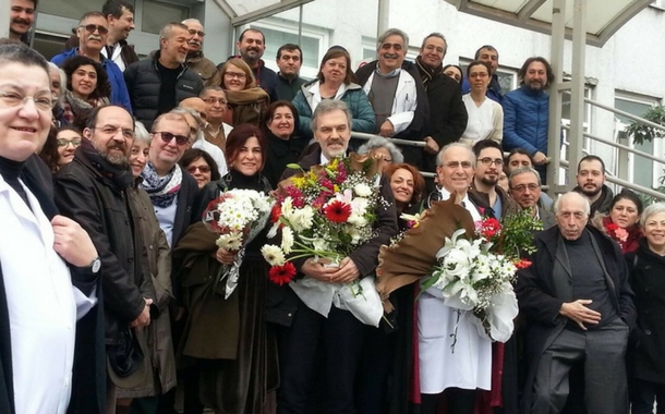 Görevden uzaklaştırma kararının iptal edilmesinin ardından Prof. Dr. Raşit Tükel ve Prof. Dr. Taner Gören İstanbul Tıp Fakültesi’ndeki görevlerine dönerken çiçeklerle karşılandı.
