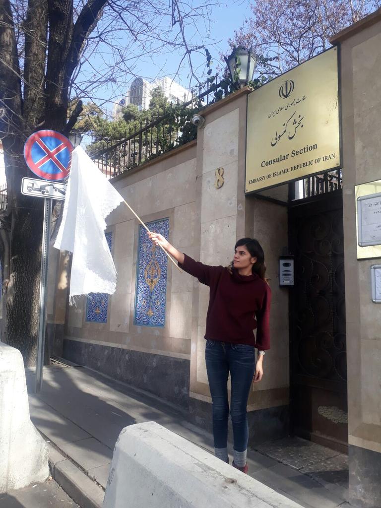 One Iranian woman, Vida Mohaved, protested the forced hijab in Iran by stepping up on a telephone box as part of the actions.