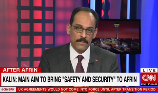 CNN International canlı yayınında TSK ve cihatçıların Afrin’in merkezini ele geçirmesine ilişkin değerlendirmelerde bulunan Cumhurbaşkanlığı Sözcüsü İbrahim Kalın, “Biz bu haberleri ciddiye alıyoruz. Bu olayları araştırıyoruz. Görünen o ki bu olaylar yaşanmış. Bazı gruplar komutanları tarafından verilen emirlere muhtemelen uymadılar. Biz bunu çok ciddi bir şekilde inceliyoruz çünkü Afrin operasyonundaki asıl amacımız en başından bu yana Afrin’de yaşayan insanlara emniyet ve güvenlik sağlamak oldu” diye konuştu.