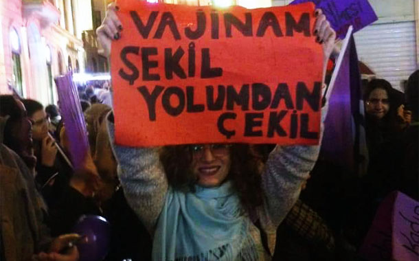 8 Mart’taki “vibratörlü”, “orgazmlı”, “sürtüklü” slogan ve dövizleri müstehcen bulanlar, bunu apolitik olarak yaftalayanlar AKP politikalarının evlerimize, yatak odalarımıza hatta döl yataklarımıza kadar girdiği bir ülkede bizim bu sorunlara karşı kendi söylem ve eylemimizle yanıt vermemizin bal gibi de politik olduğunun farkında.