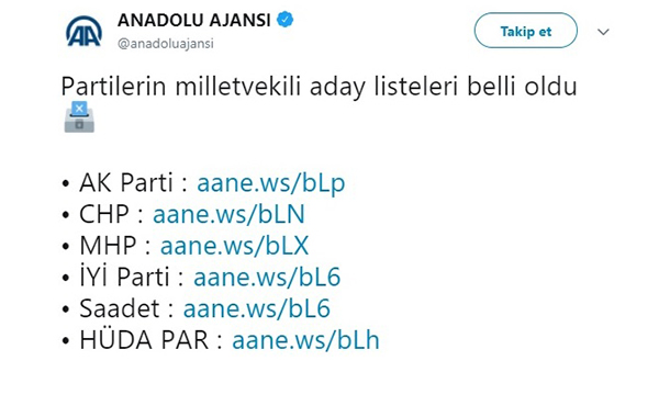 Konuya ilişkin AA’nın resmi Twitter hesabından “Partilerin milletvekili aday listeleri belli oldu” notuyla yapılan paylaşıma, çok sayıda kullanıcı tepki gösterdi.
