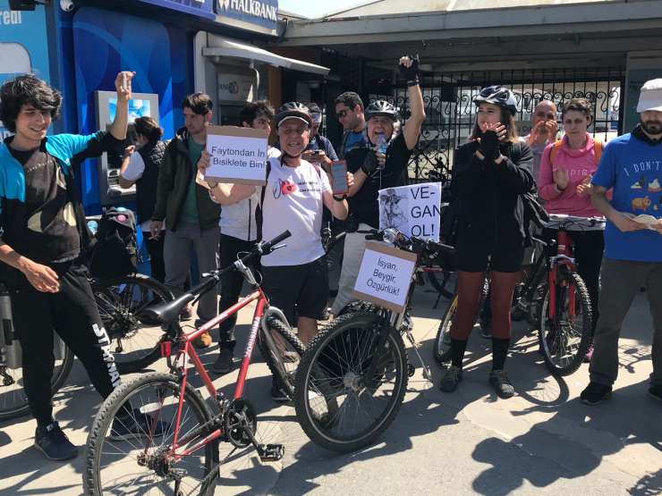 Eylem boyunca, “Faytonlar kaldırılsın beygirlere özgürlük” sloganı atılırken “Faytondan in bisiklete bin”, “Faytonlar kaldırılsın, beygirlere özgürlük” ve “İsyan, beygir, özgürlük” yazılı dövizler taşındı.