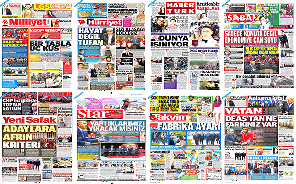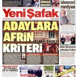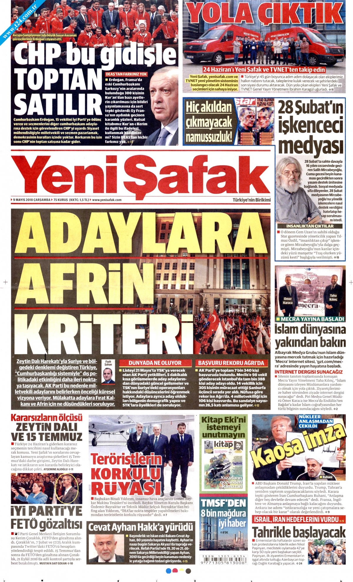 - Yeni Şafak: Sabah’ta olduğu gibi Erdoğan’ın CHP’ye ilişkin sözlerini ilk sayfanın en üstüne taşıdı. Ayrıca “Adaylara Afrin kriteri” başlığında ise AKP’nin milletvekili adaylarına, “küresel vizyon”la mülakat yaparak Afrin ve Fırat Kalkanı operasyonlarına ilişkin görüşlerinin sorulacağını kaydetti.