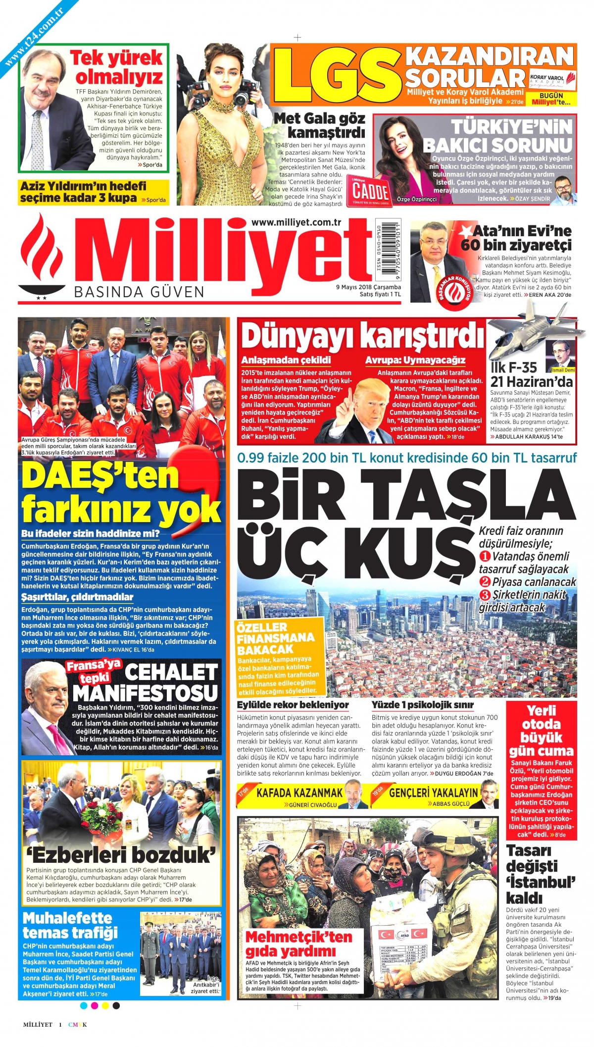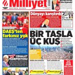 - Milliyet: AKP’nin konut kredilerine ilişkin seçim hamlesini “Bir taş üç kuş” manşetiyle verdi. Ayrıca Erdoğan’ın Fransa’da Kuran’la ilgili bildiri imzalayan aydınlara ilişkin “DEAŞ’tan farkınız yok” sözlerine yer verdi.