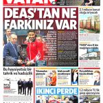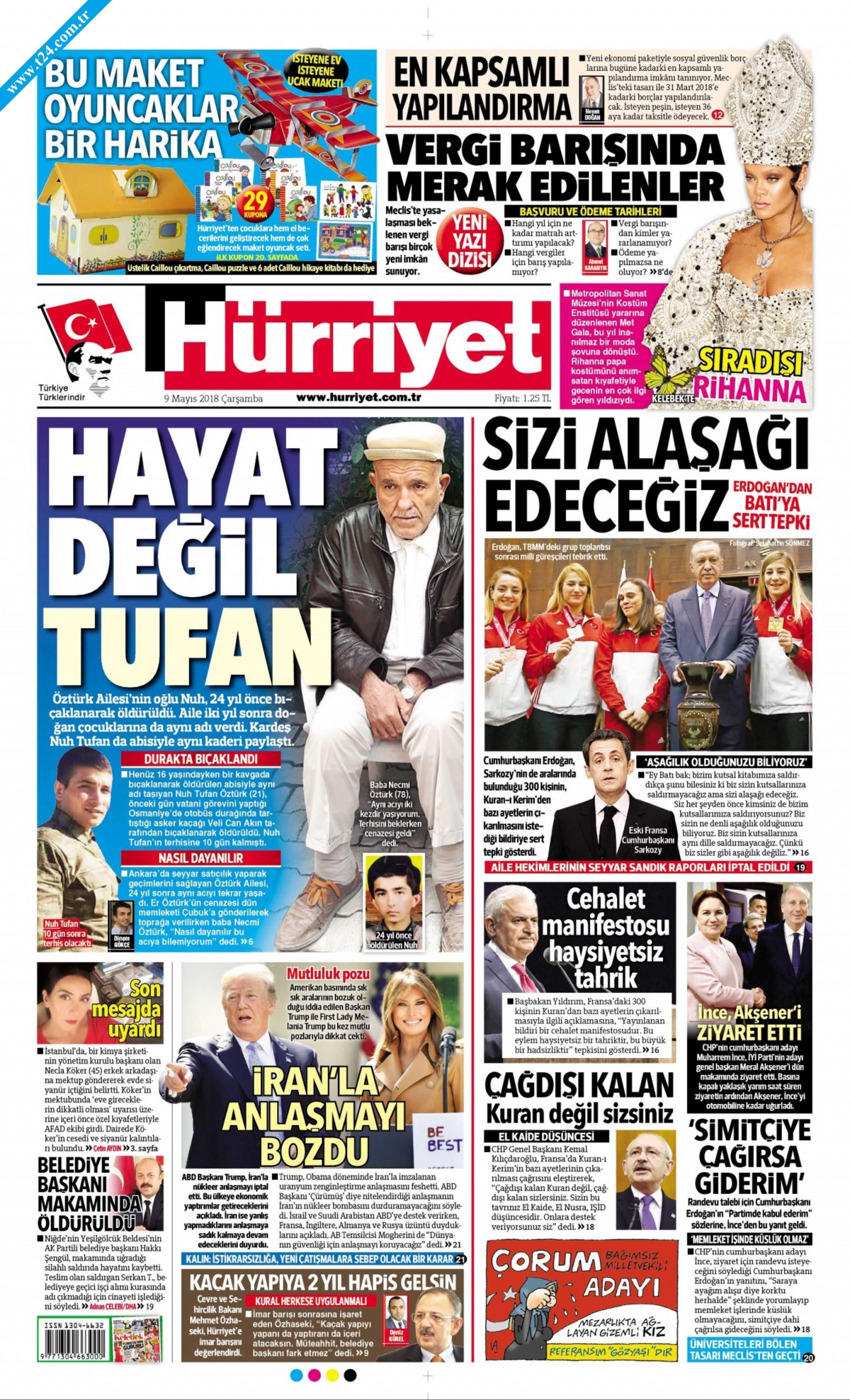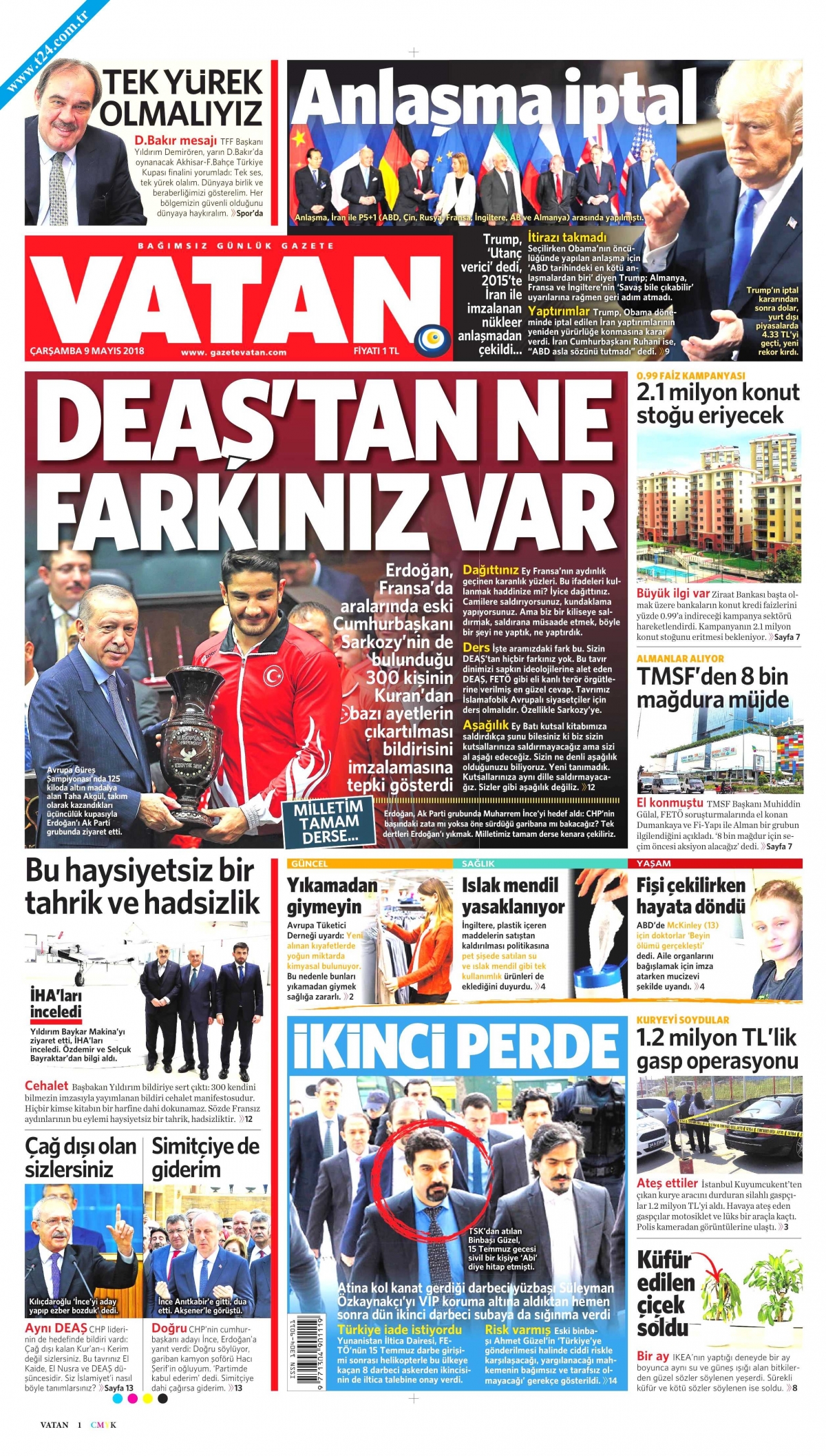 - Vatan: Erdoğan’ın Fransız aydınlara yönelik tepkisini “DEAŞ’tan ne farkınız var” sözleriyle sürmanşetine taşıdı. Trump’ın İran kararı ise “Anlaşma iptal” başlığıyla yer buldu.