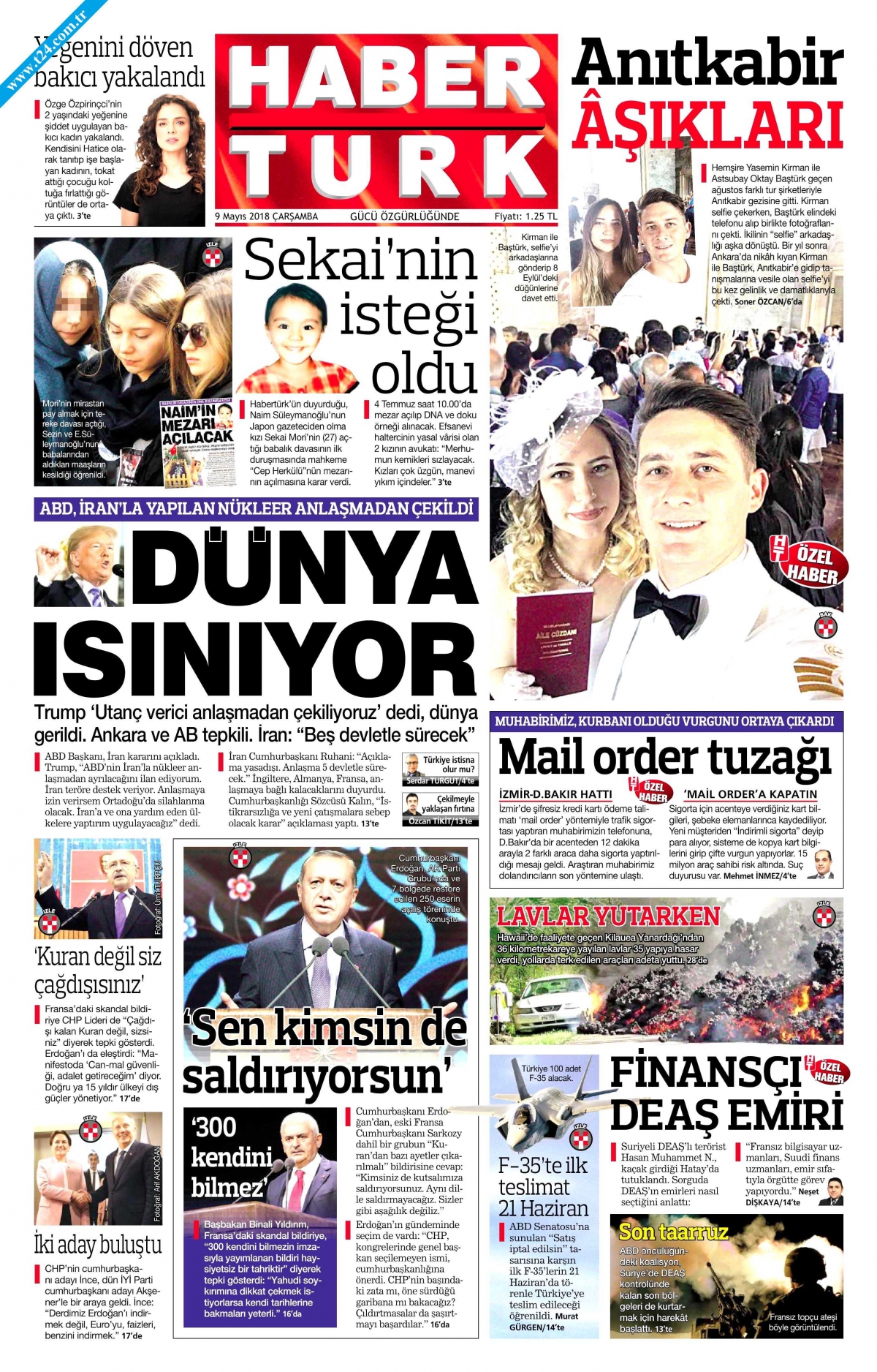 - Habertürk: “Dünya ısınıyor” başlığında ABD Başkanı Donald Trump’ın İran’la varılan nükleer anlaşmadan çekilmesine yer verdi.