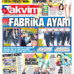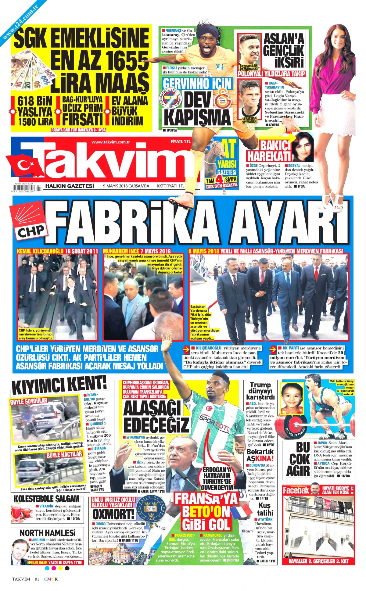 - Takvim: “Fabrika ayarı” sürmanşetiyle çıkan Takvim, AKP kalemşörlüğünün çıtasını yükseltti. CHP Genel Başkanı Kemal Kılıçdaroğlu’nun yürüyen merdivene ters yönden binmesi ve cumhurbaşkanı adayı Muharrem İnce’nin CHP Genel Merkezi’nde bindiği asansörün aşırı yükten hareket etmemesini “CHP’liler yürüyen merdiven ve asansör özürlüsü çıktı. AK Parti’liler hemen asansör fabrikası açarak mesaj yolladı” sözleriyle sundu.