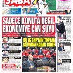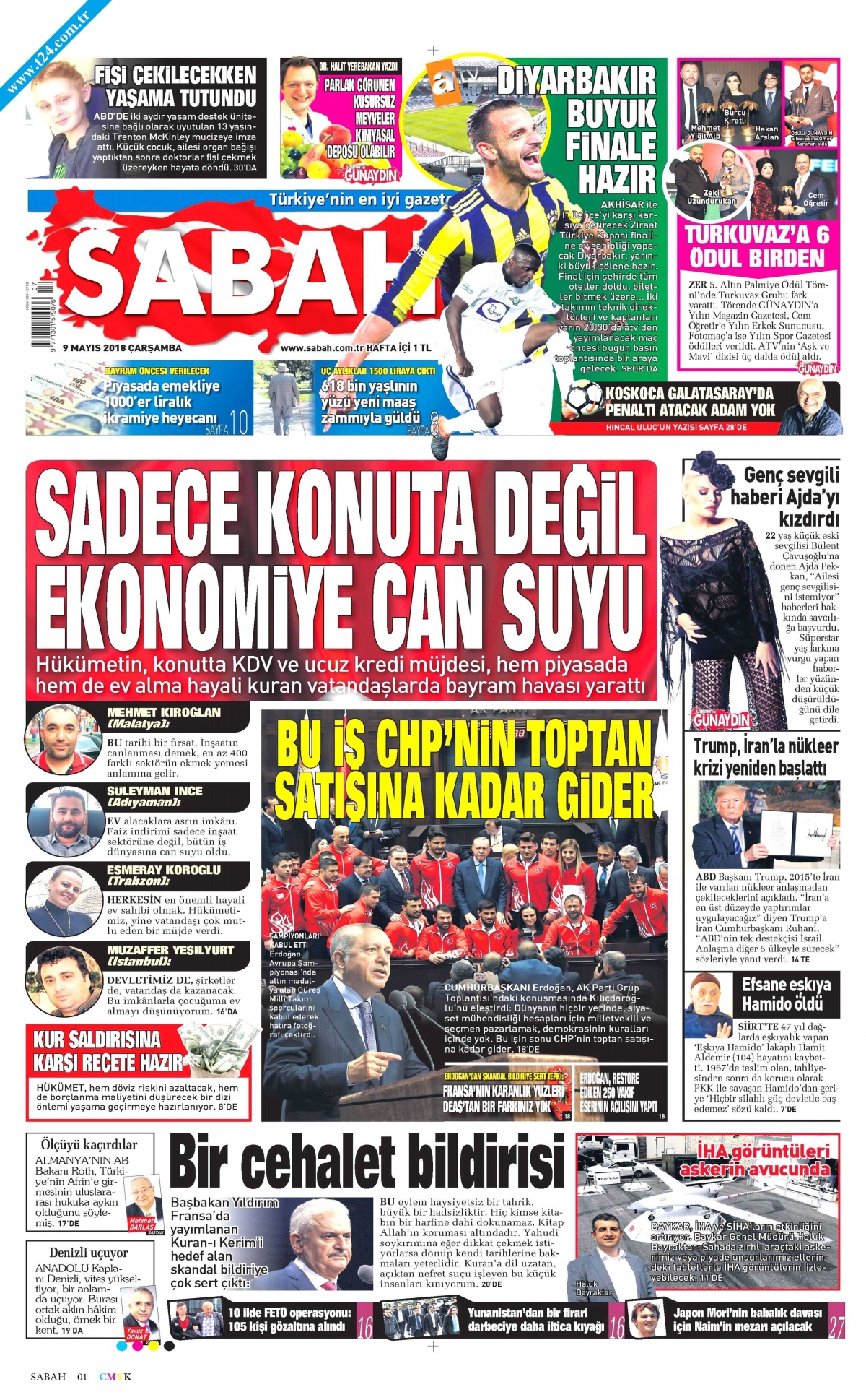 - Sabah: Baskın seçime giderken AKP’nin oy toplamak için yaptığı düzenlemeleri manşete aldı. “Sadece konuta değil ekonomiye de can suyu” manşetiyle çıkan Sabah, konutta KDV indirimi ve ucuz kredinin “hem piyasa da hem ev alma hayali kuran vatandaşlarda” bayram havası yarattığını ileri sürdü. Ayrıca Erdoğan’ın CHP’nin “siyaset mühendisliği” milletvekili ve seçmen pazarladığını ileri sürerek “Bu iş CHP’nin toptan satışına gider” sözleri de ilk sayfada yerini aldı.