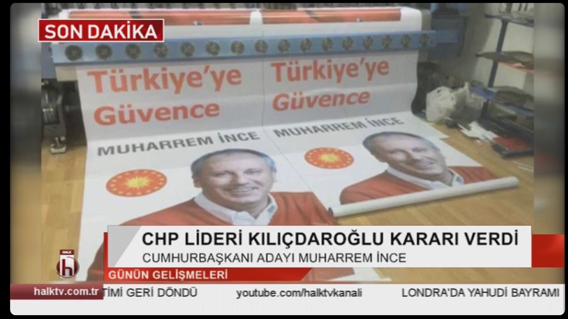 Halk TV resmi twitter hesabından yapılan paylaşımda CHP’nin 24 Haziran’da gerçekleşecek Cumhurbaşkanlığı Seçimlerinde adayının CHP Yalova Milletvekili Muharrem İnce olduğunu duyurdu. Yapılan paylaşımda “CHP Lideri Kılıçdaroğlu kararını verdi, CB Adayı Muharrem İnce” ifadelerine yer verildi.