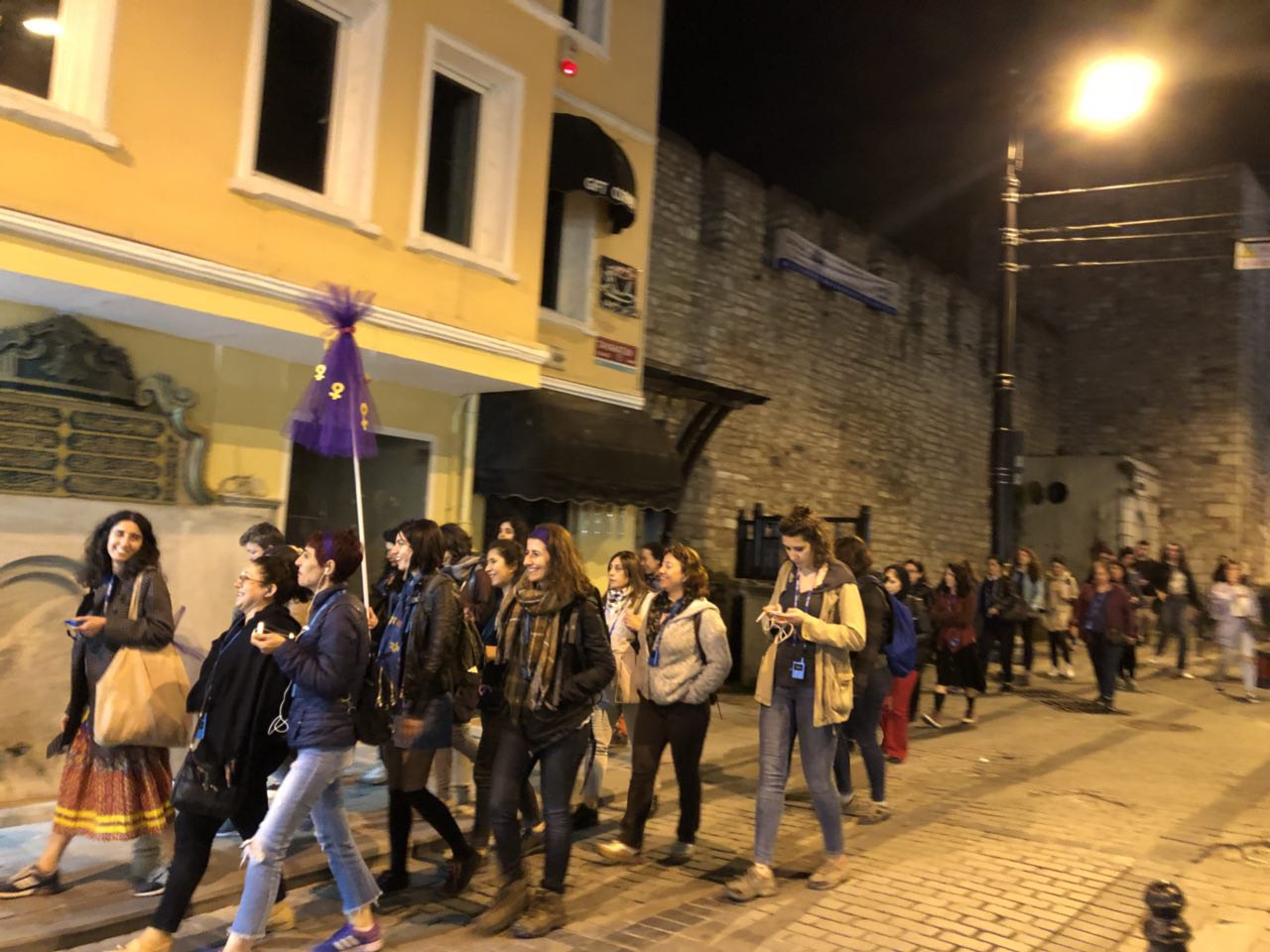 Kadın Savunma Ağı’nın çağrısıyla İstanbul’da gece turuna çıkan kadınlar, “Gece de gündüz de; sokakta ya da meydanda; otobüste, vapurda, metro da metrobüste; meyhane de ya da bar da; adımınızı attığınız her yerde kadınlar var, var olacak!” dedi