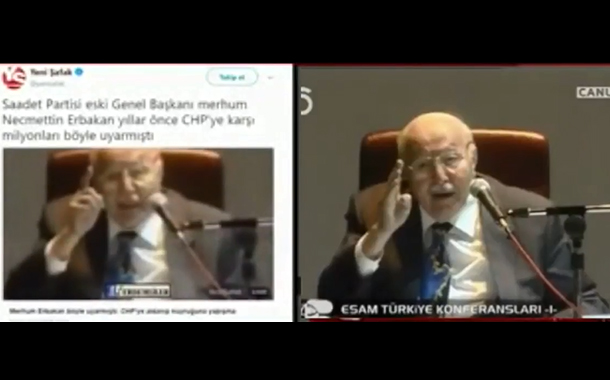 Yeni Şafak, Erbakan’ın “Ey kasketli adam; CHP’ye aldanıp da AKP’nin kuyruğuna yapışma” sözlerindeki “AKP”yi kesti, görüntüyü “Erbakan CHP’ye karşı milyonları böyle uyarmıştı” diye sundu