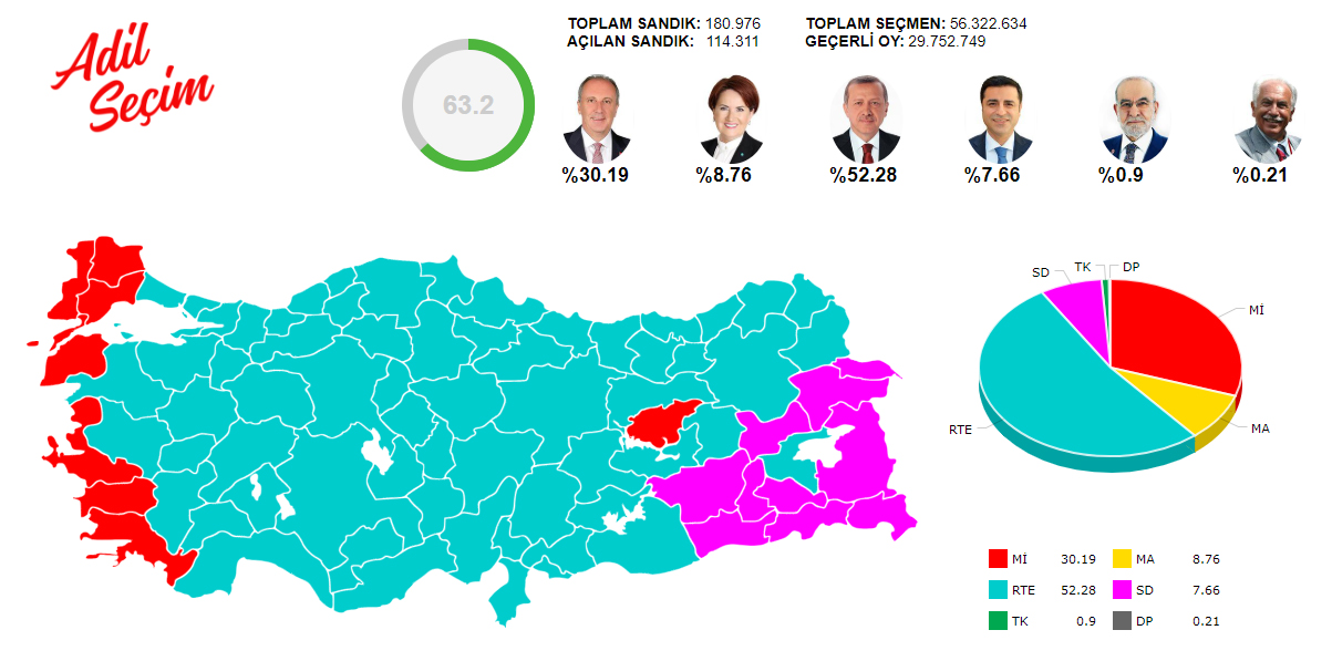 Anadolu Ajansı’nın referandumda seçim sonuçlarını manipüle etmesi sonrası Adil Seçim Platformu da anlık seçim sonuçları açıklıyor. Adilsecim.net’ten gelen verilere göre sandıkların yüzde 72,8’i açıklandı. Türkiye genelinde bu verilere göre Muharrem İnce yüzde 30,21, Meral Akşener yüzde 8,64, Tayyip Erdoğan yüzde 52,09, Selahattin Demirtaş yüzde 7,96 oranında seyrediyor.