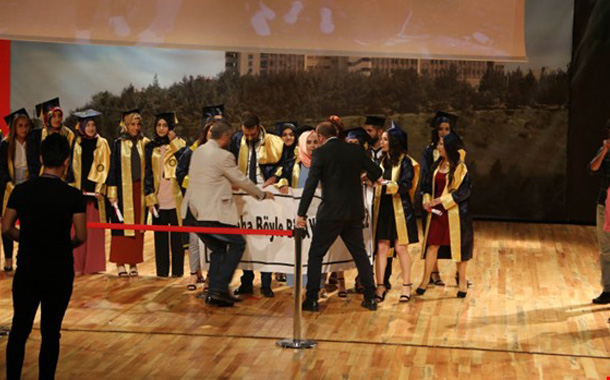 Rektörün talimatıyla özel güvenlikler ise üniversitelilere müdahale etti ve “siyasi olduğu” gerekçesiyle pankarta el koydu. Üniversiteliler bunun üzerine mezuniyet törenini terk etti.