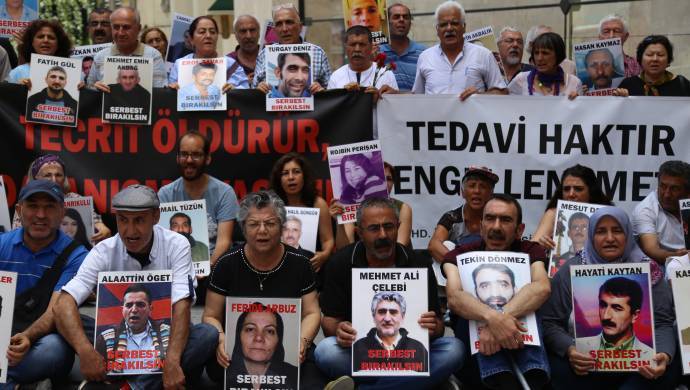 Kronik kalp hastası Sabri Kaya’nın hastalığına dikkat çekilen eylemde basın açıklamasını İHD üyesi Taylan Bekin yaptı. OHAL koşullarında tutuklamaların artması ile tutukluların yaşam koşullarının çekilmez bir hal aldığını belirten Bekin, “Ağır hasta mahpusların tedavi edilmemesi bir yana zorunlu ilaçlarına ulaşmaları dahi engellenmektedir. Ambulans yerine ring aracı ile hastaneye götürülme, kelepçeli muayenenin dayatılması, çıplak arama ve düzenli tedavilerin yapılmaması mahpusların sağlık durumlarını daha da ağırlaştırmakta ve giderek ölümlerine davetiye çıkarmaktadır” dedi.
