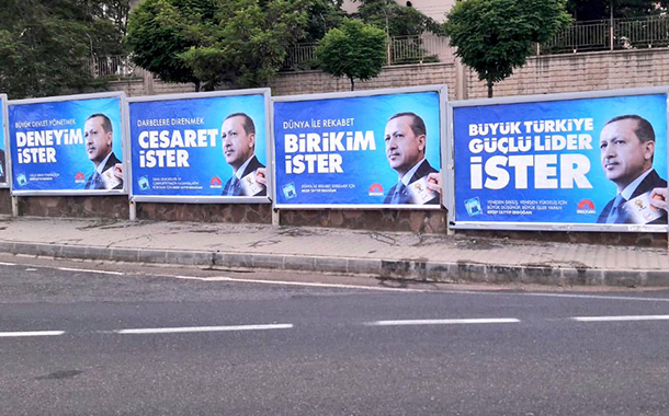 Türkiye’nin dört bir yanında bulvarlar, caddeler, sokaklar, alt ve üstgeçitler, büyük binalar ve panolar Tayyip Erdoğan’ın sureti ile doldu. Mehveş Evin, Artı Gerçek’teki köşesinde Erdoğan ve AKP’nin reklam afişlerini ile bunun için devlet olanaklarının seferber edilmesini yazdı.