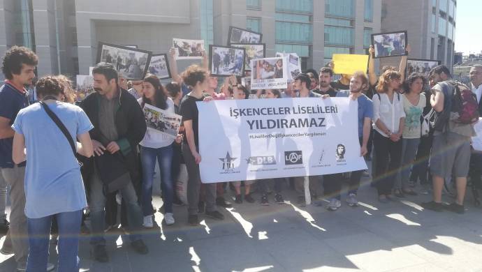 Kadıköy’de polisler tarafından yaka paça gözaltına alınan ve gece boyu işkence gören liseli gençlik örgütleri Çağlayan’da bulunan İstanbul Adliyesi önünde basın açıklaması yaptı. “İşkenceler liselileri yıldıramaz” pankartının açıldığı eyleme, HDP Milletvekili adayları Sema Uçar ile Musa Piroğlu, CHP Milletvekili Sezgin Tanrıkulu ile çok sayıda kişi katıldı. Açıklamada “Direne direne kazanacağız”, “İşkence insanlık suçudur” sloganları atıldı.