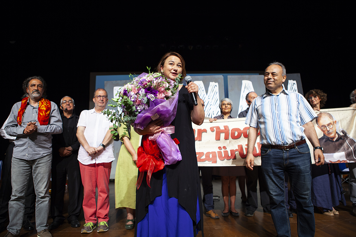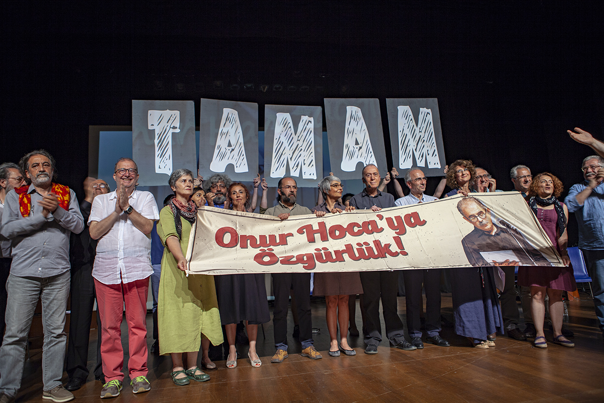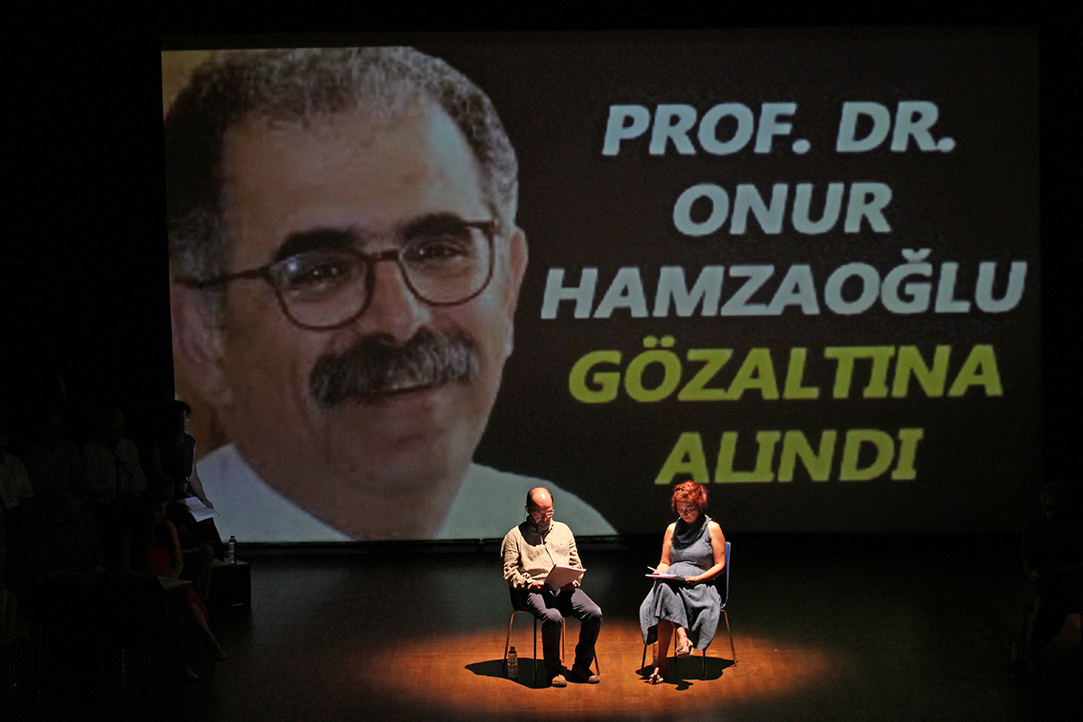 Saip’in konuşmasının ardından okuma oyunu sahnelendi. Oyunun hemen ardından sahneye çıkan Barış Akademisyenleri “Onur Hoca’ya özgürlük” pankartı açarak “Tamam” yazdı.