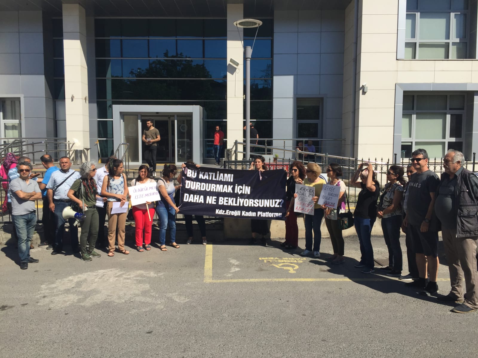 Zonguldak’ın Ereğli ilçesinde boşanmak üzere olduğu Y.Ö’ye Ereğli Adliyesi önünde otomobili ile çarparak kaçan Aydın Ö’nün ifadesi alındıktan sonra serbest bırakıldı. Ereğli Kadın Platformu da KESK Zonguldak Şubeler Platformu ile birlikte Ereğli Adliyesi önünde açıklama yaparak Aydın Ö’nün serbest bırakılmasını protesto etti.