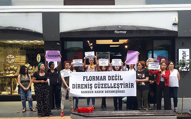 Samsun Kadın Dayanışması, sendikalı oldukları için işten çıkartılan 120 işçinin direnişinin 23. gününde Çiftlik Caddesi’ndeki Flormar mağazasının önünde eylem yaparak Flormar’a karşı boykot çağrısı yaptı.