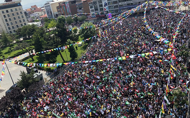 HDP’nin Van’da gerçekleştirdiği final mitingine yüzbinler katıldı. Kentin tüm sokak ve caddelerini dolduran kalabalık, polisin kurduğu bariyerleri aşa aşa meydana ulaştı