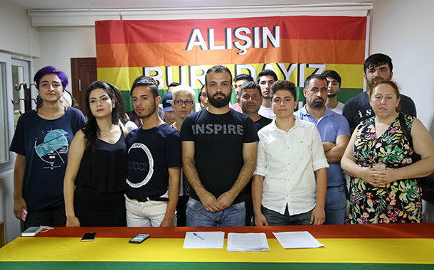 İHD Adana Şubesi’nde düzenlenen basın toplantısında, üzerine “Alışın, buradayız, gitmiyoruz” yazılı gökkuşağı bayrağı asıldı.