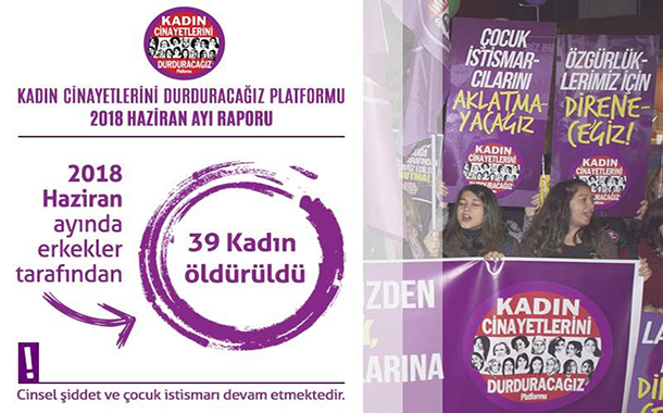 Kadın Cinayetlerini Durduracağız Platformu, 2018 Haziran ayı veri raporunu yayımladı. Rapora göre haziran ayı içerisinde 39 kadın erkekler tarafından öldürüldü