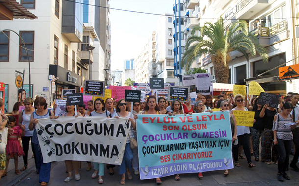 İzmir Kadın Platformu çocuk istismarı ve çocukların öldürülmesine karşı Alsancak ÖSYM binası önünde toplanarak Kıbrıs Şehitleri Caddesi boyunca yürüyüş yaptı. “Eylül, Leyla ve daha nice çocuğun ölümünden istismar önergelerini Meclis’te reddedenler sorumludur” vurgusu yapan kadınlar Türkan Saylan Kültür Merkezi önünde basın açıklaması yaptı.